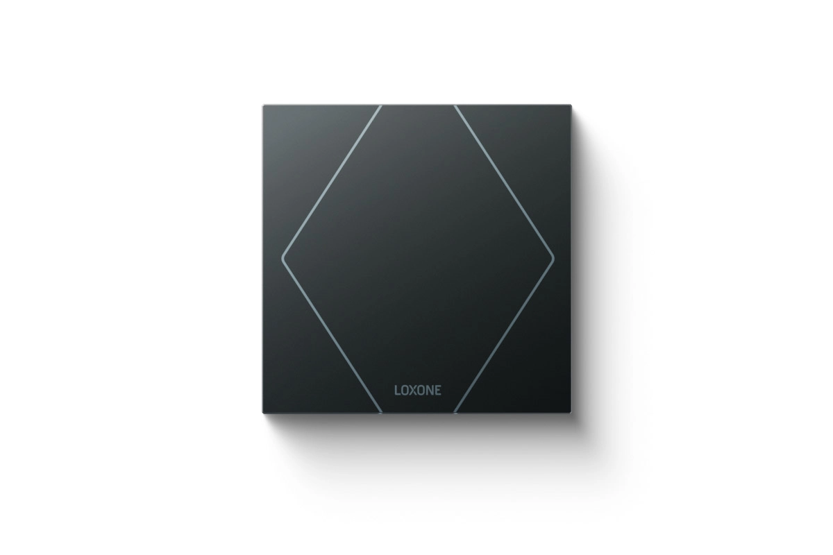 Der Loxone Touch Pure Air verfügt über fünf Tastpunkte auf einer Glasfront, zur Bedienung der wichtigsten Funktionen eines Raumes. Bei Berührung einer Taste erfolgt ein Klicken als akustische Bestätigung.